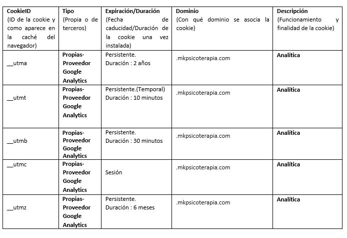 La entidad JUAN ANTONIO MORILLAS KIEFFER, con NIF/CIF: 42999836W, domicilio en la PERE DEZCALLAR I NET Nº13, 2ª PLANTA P 6 07003 PALMA DE MALLORCA, BALEARES, dirección de correo electrónico: MKPSICOTERAPIA@GMAIL.COM y web: WWW.MKPSICOTERAPIA.COM le informa al usuario de manera expresa que, de conformidad con el art. 22.2 de la Ley 34/2002, de 11 de julio, de servicios de la sociedad de la información y de comercio electrónico (LSSI), esta web utiliza 'cookies' propias y de terceros para ofrecerle una mejor experiencia y servicio. Al navegar o utilizar nuestros servicios, el usuario acepta de manera expresa el uso que hacemos de las 'cookies'. Sin embargo, el usuario tiene la opción de impedir la generación de 'cookies' y la eliminación de las mismas mediante la selección de la correspondiente opción en su navegador. En caso de bloquear el uso de 'cookies' en su navegador, es posible que algunos servicios o funcionalidades de la página web no estén disponibles.