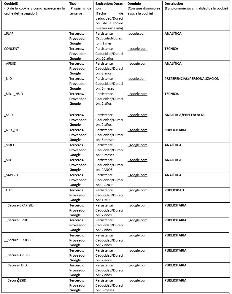 La Entidad utiliza en este sitio web las siguientes cookies que se detallan a continuación: